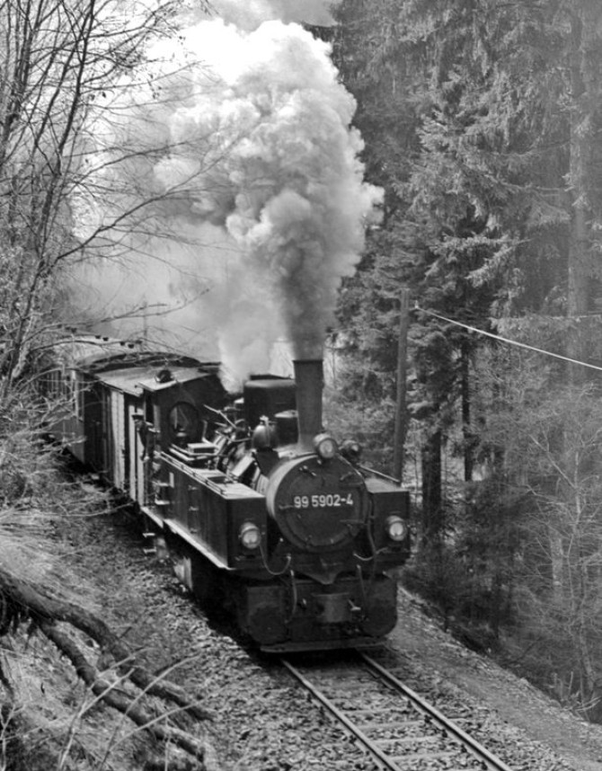 Die berühmte Parallelausfahrt in Alexisbad mit zwei Lokomotiven der Mallet-Bauart. 99 5902 und 99 5904 verlasen gemeinsam 1979 den Bahnhof. Copyright: Karsten Risch / Slg. Eisenbahnstiftung