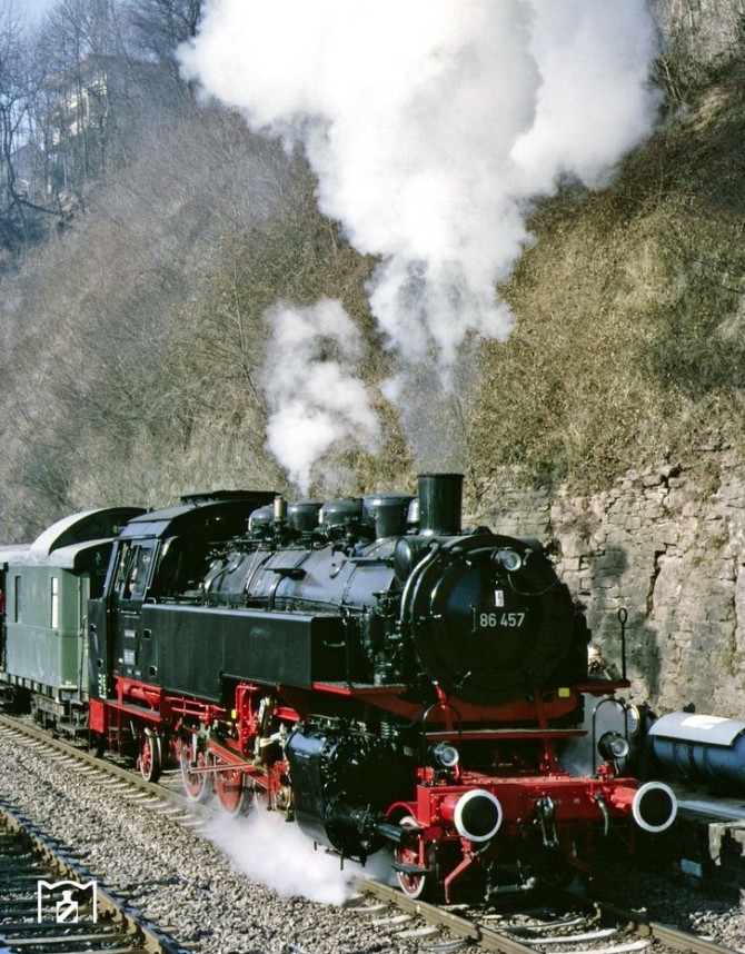 Die Museumslok 86 457 im Jahr 1985 vor einem Sonderzug bei einer Scheinanfahrt. Copyright: Joachim Bügel/ Slg. Eisenbahnstiftung