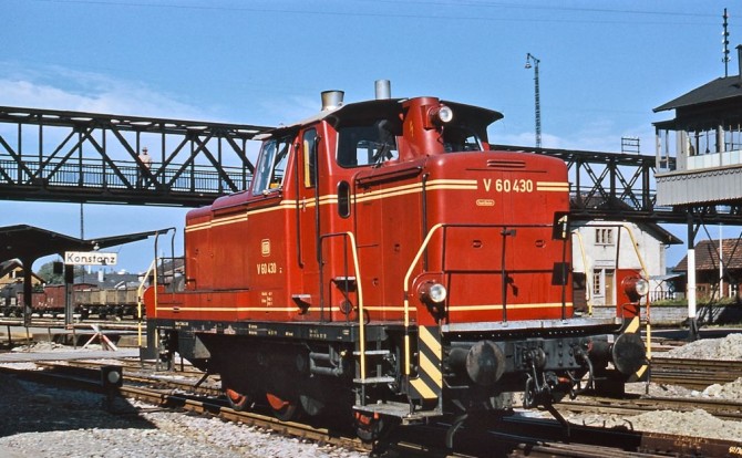 Bild unten: Im besten Sonnenlicht zeit die V 60 430 ihren "Rücken" im Bhf. Konstanz. copyright: Robin Fell / Slg.Eisenbahnstiftung.